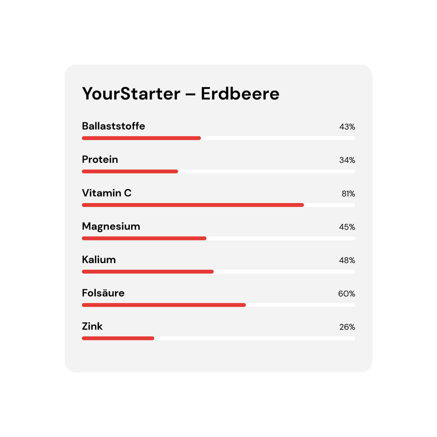 Erdbeeren (36%), Bananen (32%), Datteln, ERDNUSSmus (100% Erdnüsse), Leinsamen, SOJAflocken (100% Sojabohnen), GLUTENFREIE HAFERflocken, Spinat, Maca-Pulver, alle Zutaten stammen aus biologischer ProduktionAllergene