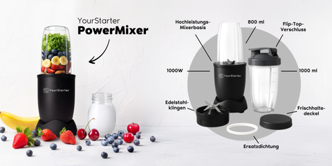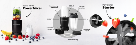 Ja, der PowerMixer eignet sich auch zum Mixen von Smoothies, Shakes, Suppen und sogar zum Zerkleinern von Nüssen und Gemüse.